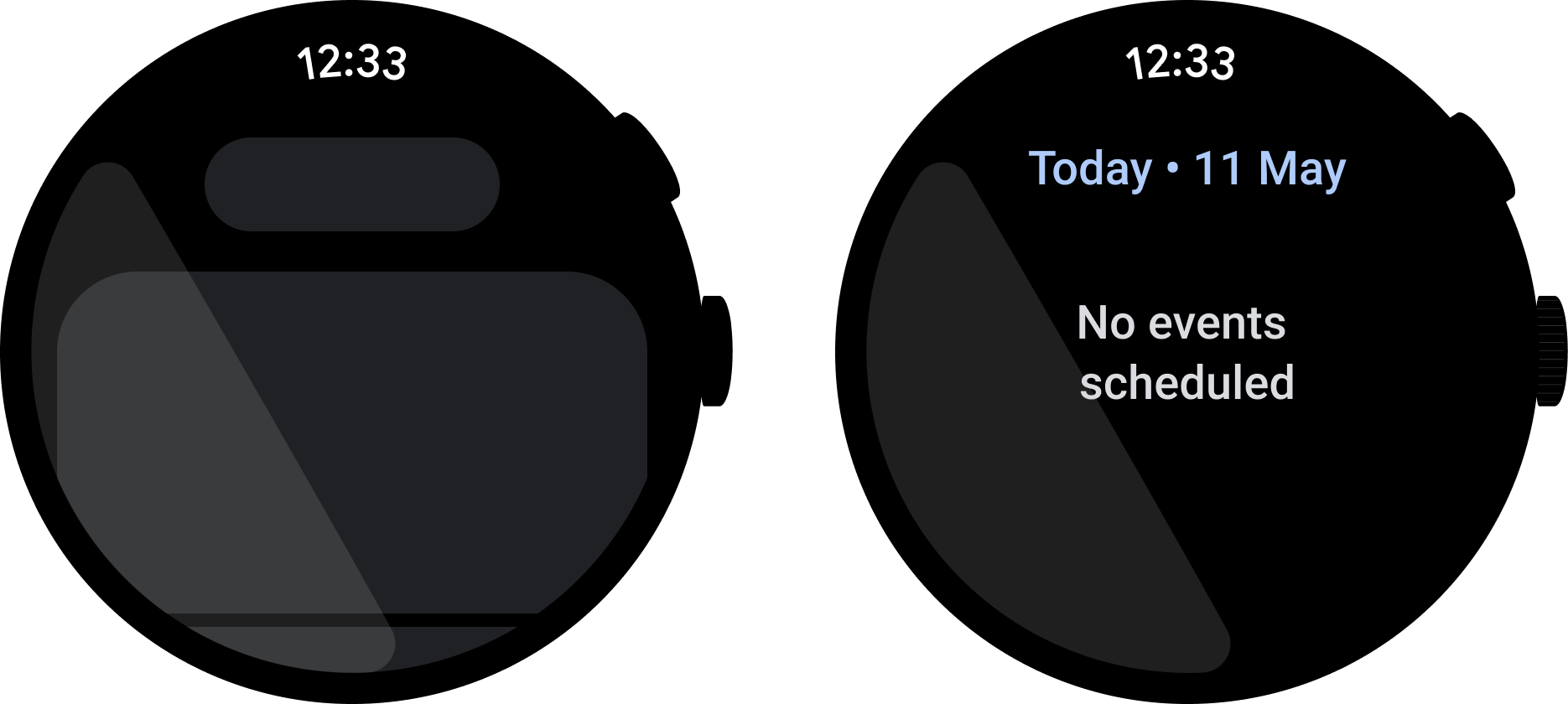 Display the app icon centrally during app starts, so users see the app icon first. This improves brand recognition and is one way to show progress. Use a black window background with the app icon. The app icon must be a 48x48dp circular icon that is positioned in the center of the watch face. The splash screen icon must match the app launcher icon. Learn more about how to add a splash screen.