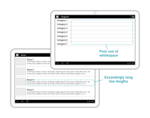 In addition to addressing these user expectations, it's often necessary to provide more content on larger devices to avoid leaving too much whitespace or unwittingly introducing awkward interactions. In the following figure, you can see some of the problems that can arise when adapting a user interface design for a larger window: