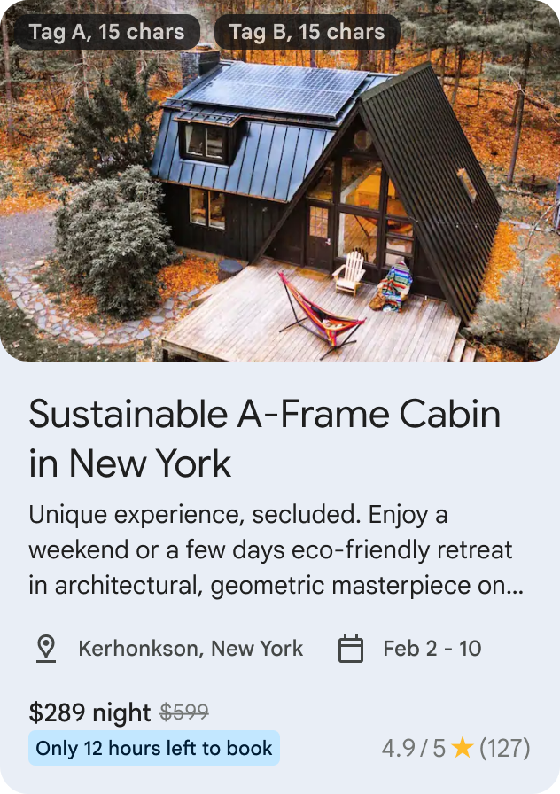 | Badges | Optional | Each badge is either free text (max 15 chars) or small image. Special UX treatment on top of image/video, for example, as badge overlay on the image