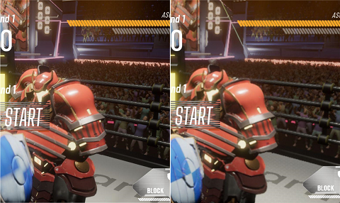 A split screen view of the highest graphics settings on the left (Blue Robot) side, and lowest graphics settings on the right (Red Robot) side.