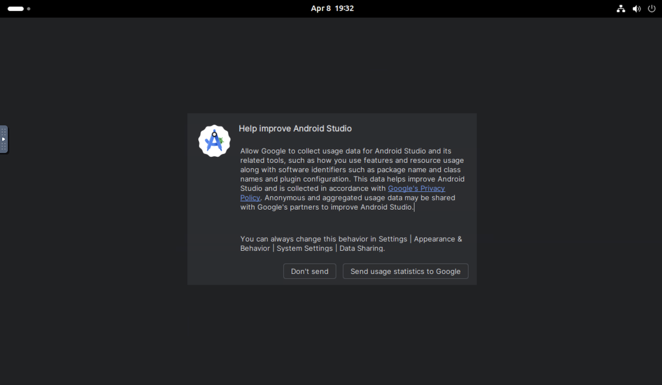 Once loaded, you will land in the VM linux environment where Android Studio launches. Choose whether or not you would like to send analytics to Google.