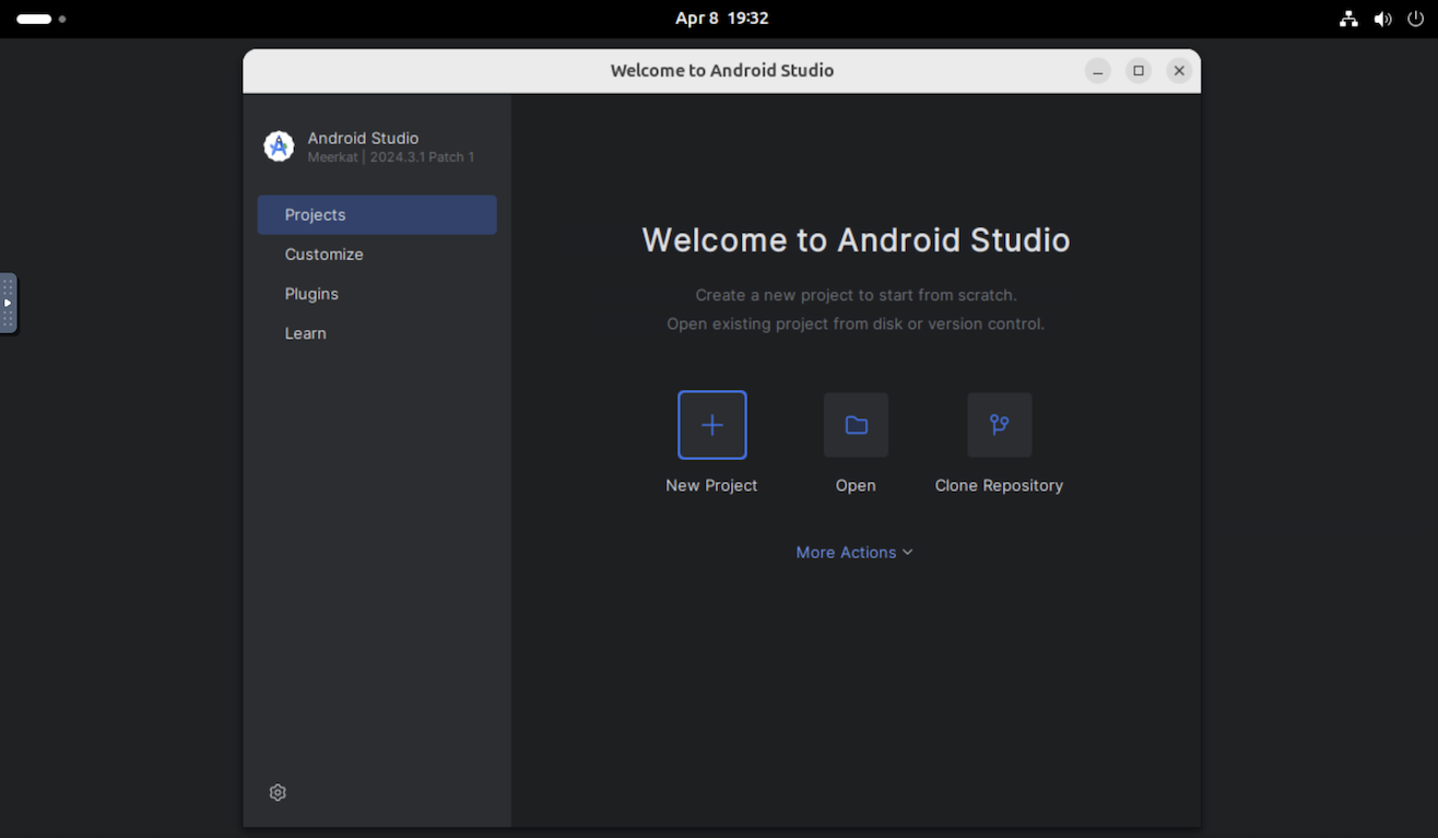 To start a new project or open a project for the first time, either create a New Project, Get from VCS, or click More Actions and select Import an Android Code Sample to get started with an Android project.
