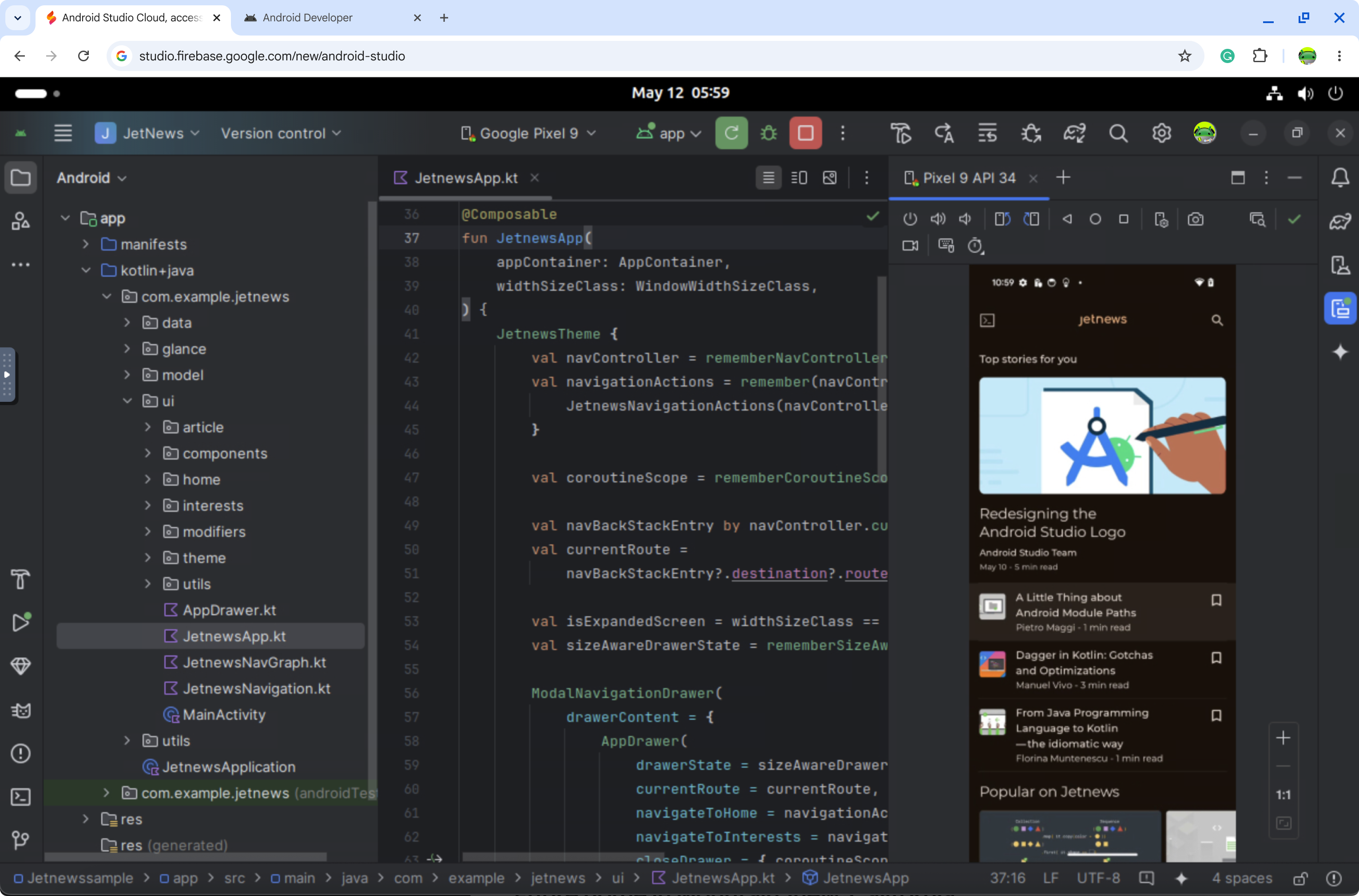 Android Studio Cloud, accessed through Firebase Studio, enables developers to conveniently open Android Studio projects anywhere with an internet connection. While we're experimenting with streaming technologies, you'll be interacting with a remotely streamed Linux virtual machine (VM) running Android Studio on the web. Expect a user experience similar to running the Linux version of Android Studio.