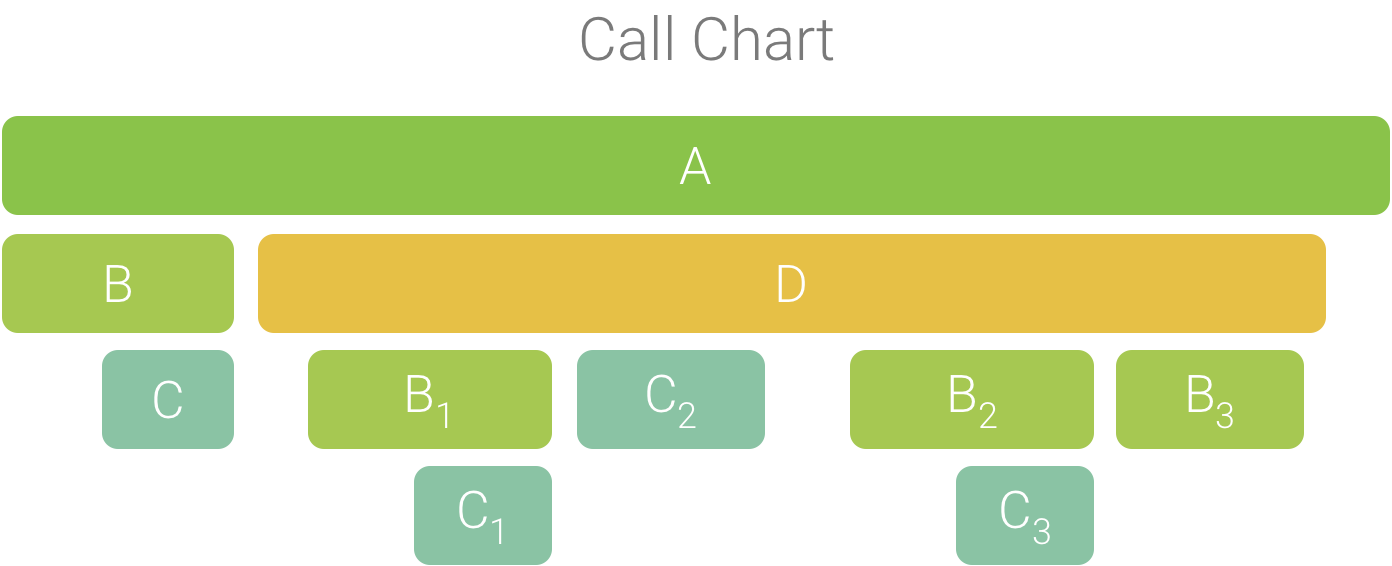 Figure 1. An example call chart that illustrates self, children, and total time for method D.