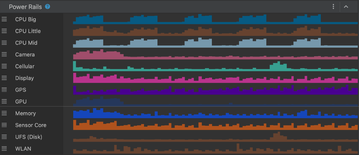 Starting in Android Studio Hedgehog, the Power Profiler shows power consumption on devices. You can view this new data in the On Device Power Rails Monitor (ODPM). It segments the information by subsystems called "Power Rails". See Profileable power rails for a list of supported sub-systems.