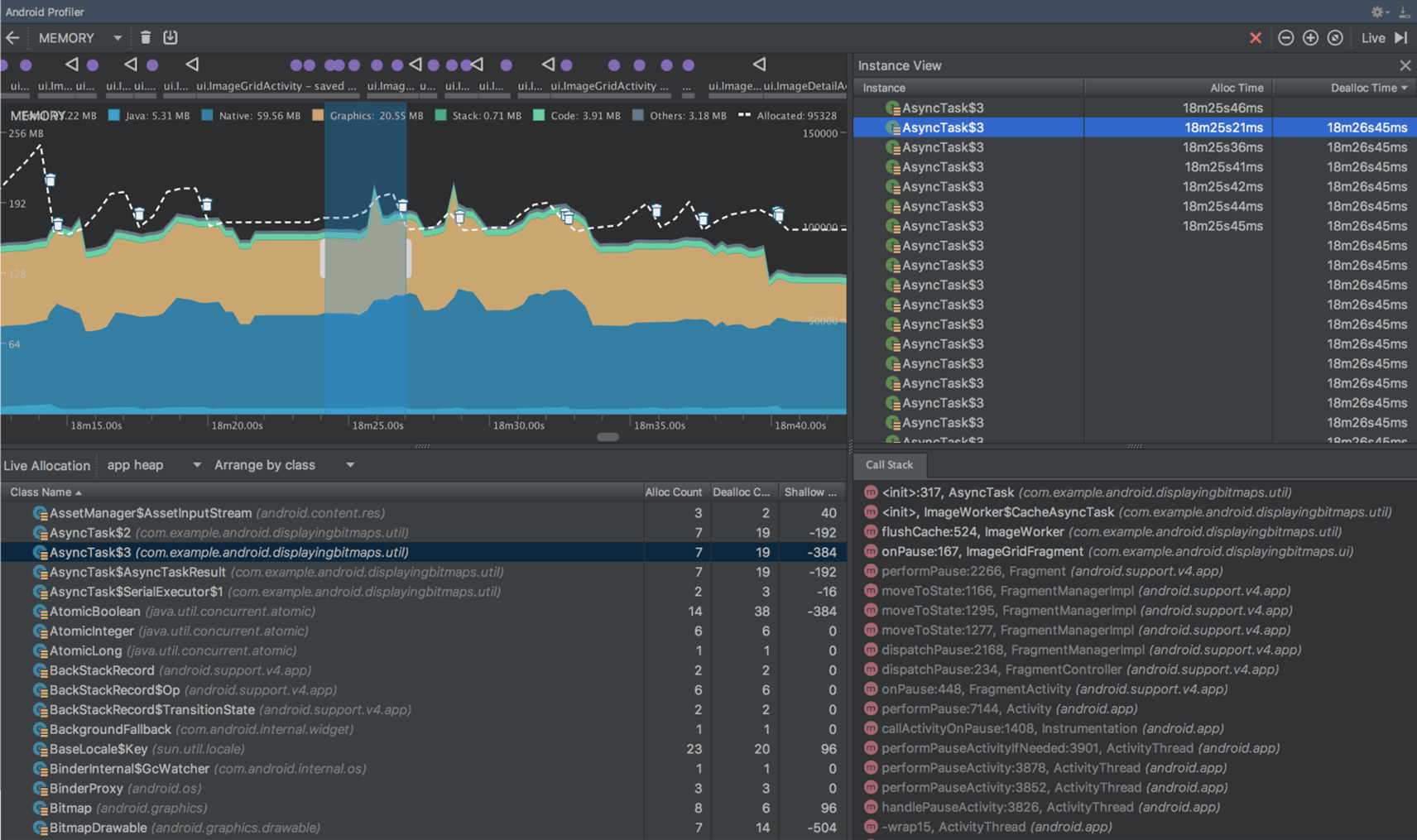 The Memory Profiler helps you identify memory leaks and memory churn that can lead to stutter, freezes, and even app crashes. It shows a realtime graph of your app's memory use, lets you capture a heap dump, force garbage collections, and track memory allocations.