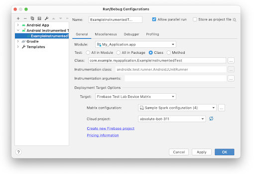 Android Studio provides integrated tools that allow you to configure how you want to deploy your tests to Firebase Test Lab. After you have created a Firebase project, you can create a test configuration and run your tests: