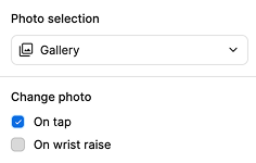 When Photo selection is set to "Gallery," the user can select multiple photos for this slot, and the watch cycles through them at different points, depending on what you select under "Change photo:"