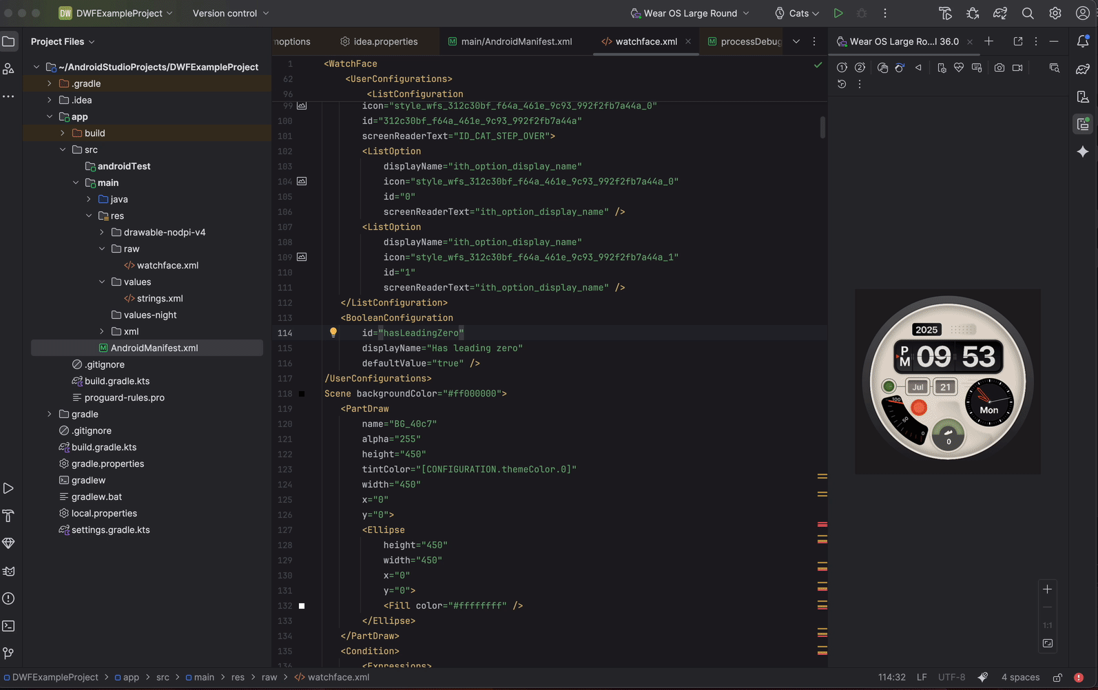 Android Studio provides editor support for Watch Face Format to help you write and debug your XML definitions.